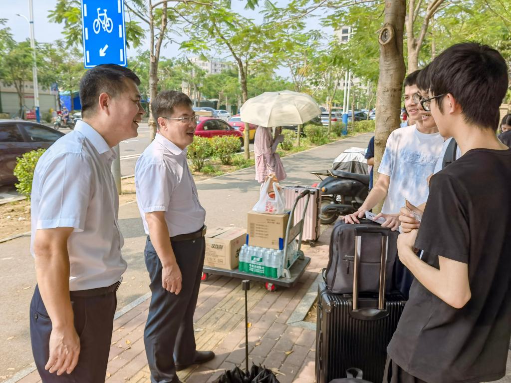 10月1日,学校党委书记杨洲深入湖光校区,看望慰问师生。杨洲先后来到南门广场、门诊部、饭堂、学生宿舍等,详细了解了学生离校乘车、就医治疗、饭菜供应、宿舍管理等情况。