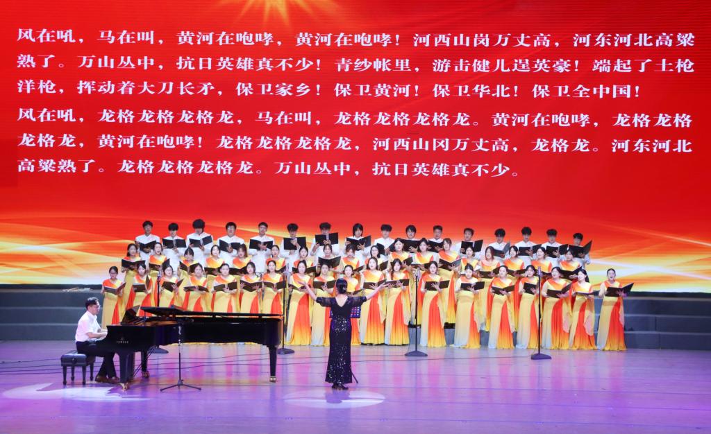 杨洲以“九一八”事变94周年为切入点,讲述了中华民族14年抗战的艰苦历程和伟大胜利的历史意义,并逐一深入讲解了《旗正飘飘》《在太行山上》《保卫黄河》《没有共产党就没有新中国》《在希望的田野上》等五首歌的创作背景、历史价值和时代意义,他引经据典,掷地有声,生动呈现了一部波澜壮阔的民族奋斗史。从国难当头时中华儿女浴血奋战的悲壮,到中国共产党领导的八路军在太行山上筑起钢铁长城,再到全民族抗战发出震天动地的怒吼,直至揭示出中国共产党是历史与人民的必然选择,从革命的战火硝烟到和平建设的伟大征程,每一个音符都饱含着深情,每一个故事都震撼人心。钢琴伴奏铿锵有力,合唱气势恢宏,现场掌声不断,气氛热烈。