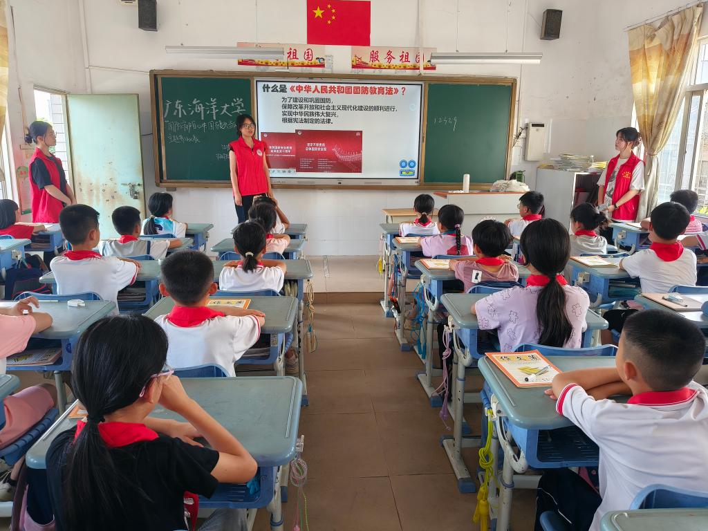 为深入推进青少年法治学习宣传教育,增强学生的法律意识和国防观念,进一步弘扬爱国主义精神。4月23日下午,在第76个海军节来临之际,学校党政办公室(法治工作办公室)组织法律援助协会和法政学院法学专业学生党支部部分学生到麻章区志满小学开展“送法进校园——国防教育法普法义教”主题活动。